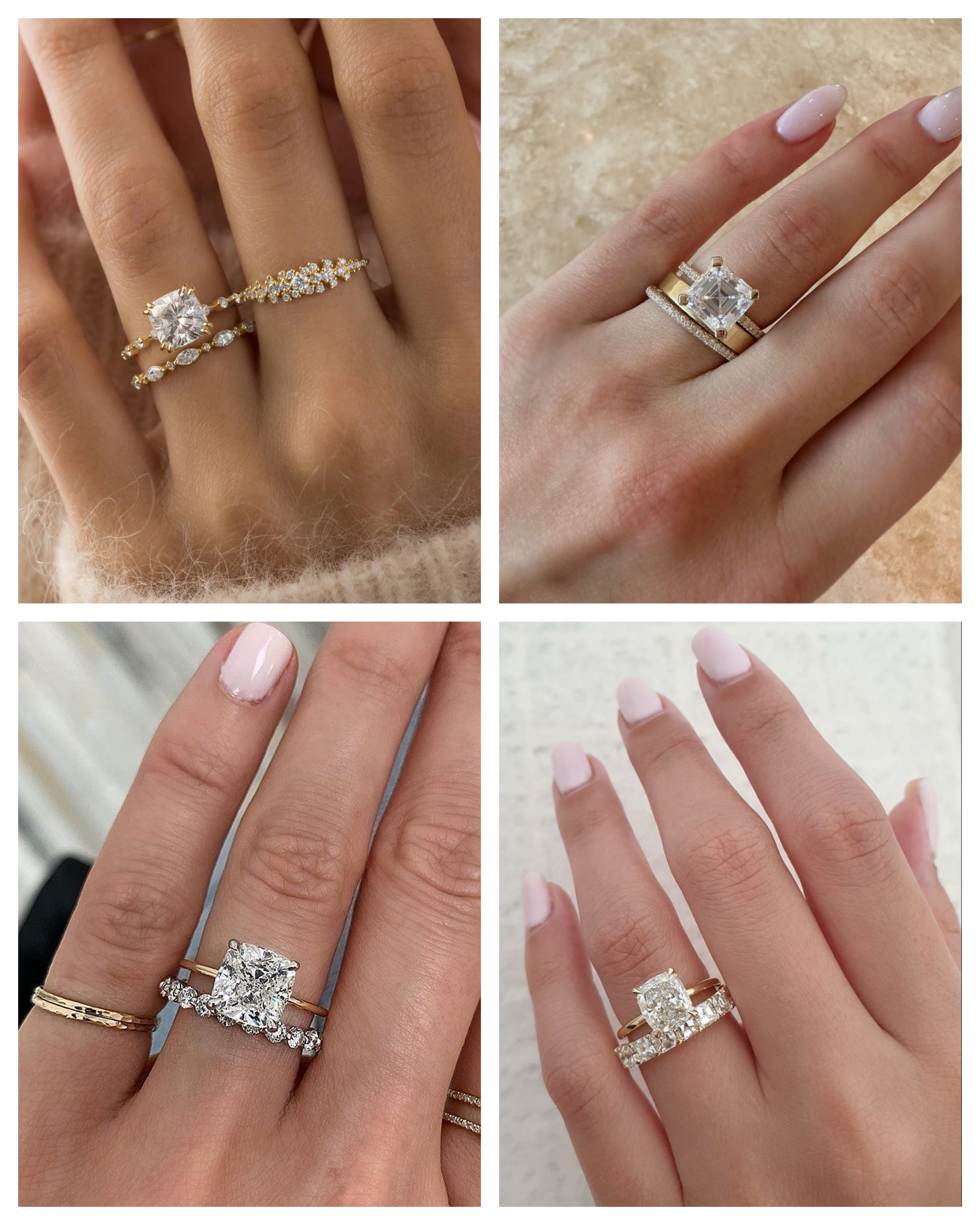 Cushion cuts sit somewhere between a square and a circle, often evoking a soft, vintage feel. Curved bands are ideal here, as they mirror the cushion’s rounded corners for a seamless fit. To lean into the romantic, antique aesthetic, consider vintage-style bands featuring milgrain edging or engraving. Alternatively, for a bold juxtaposition, you can pair the soft curves of the cushion with geometric Art Deco-inspired bands, adding structure to the softer look.