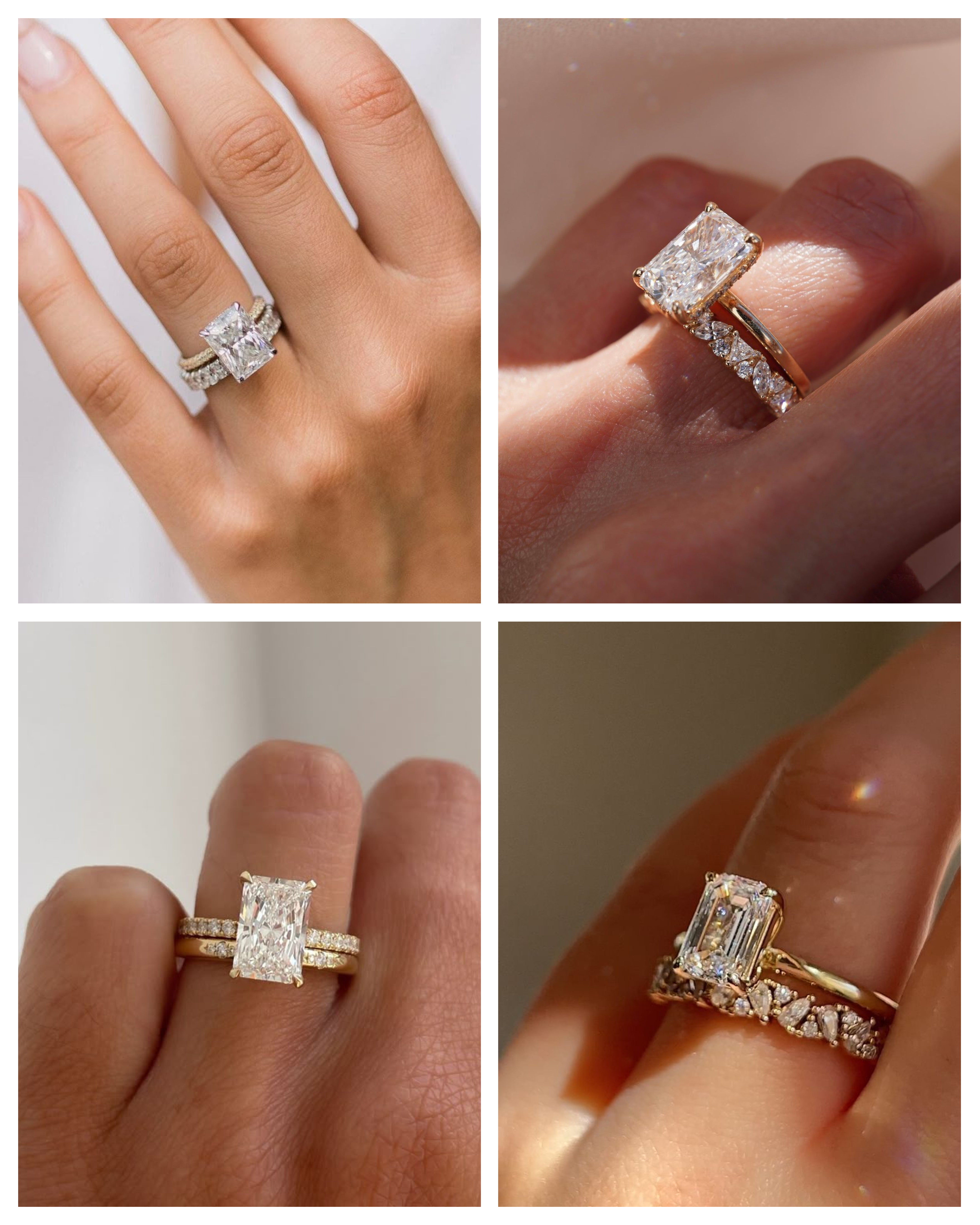 Radiant cuts combine the silhouette of an emerald cut with the brilliance of a round cut. This hybrid nature allows for flexible styling. Channel-set bands work well to echo the rectangular geometry, while thin pavé bands enhance the stone's intense sparkle without competing for attention. If you want to highlight the cut's intricate faceting, vintage-inspired bands with milgrain details provide a beautiful frame that balances structure with brilliance.