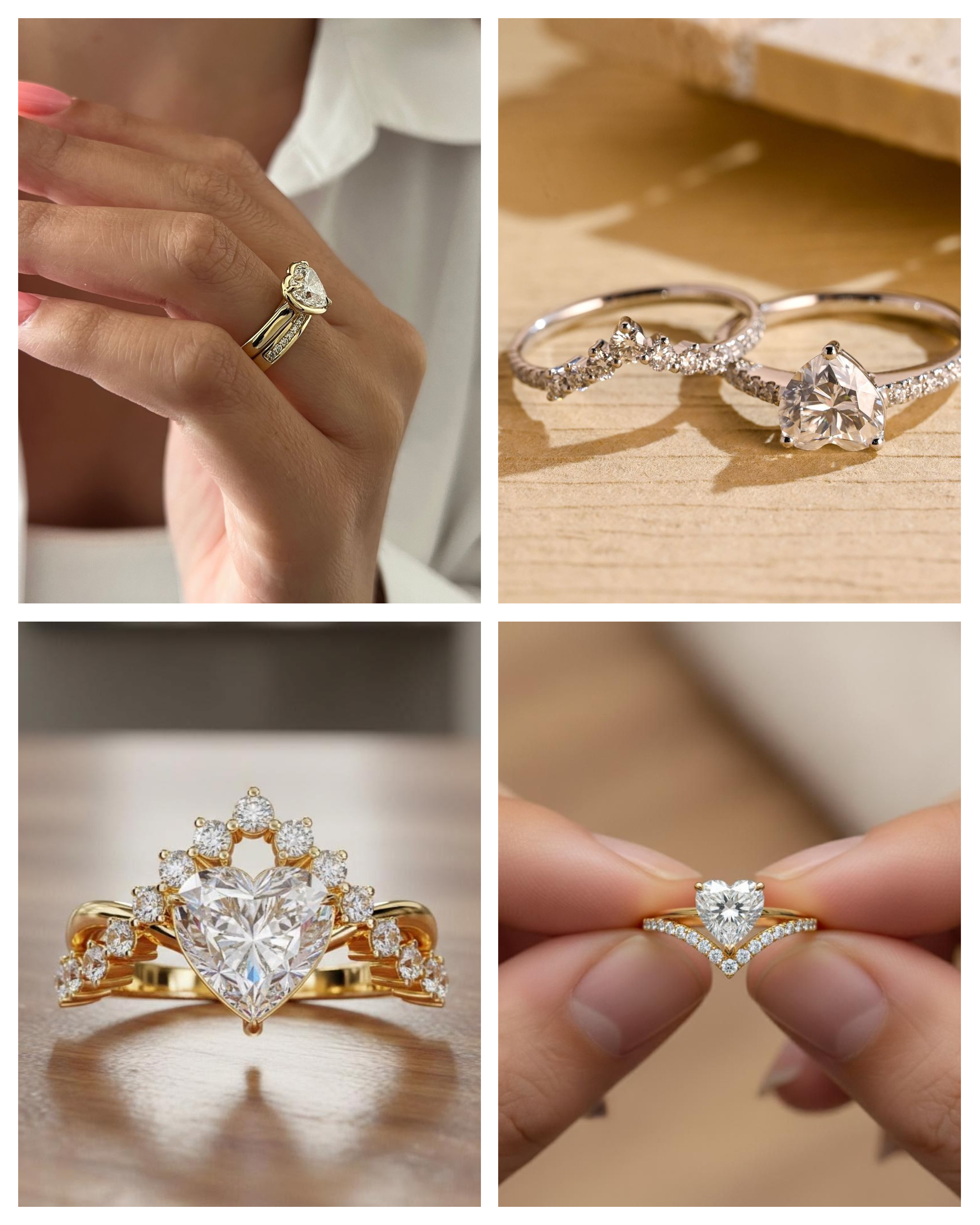 Heart-shaped rings are rare, romantic, and possess a very distinct silhouette. It is vital to choose a band that doesn't distract from the heart shape. Curved or notched bands are usually required to fit snugly against the cleft or the point of the heart. Simple, thin bands are often the best choice to keep the spotlight on the center stone. If you want sparkle, opt for delicate pavé bands that add brilliance without obscuring the unique outline of the diamond.