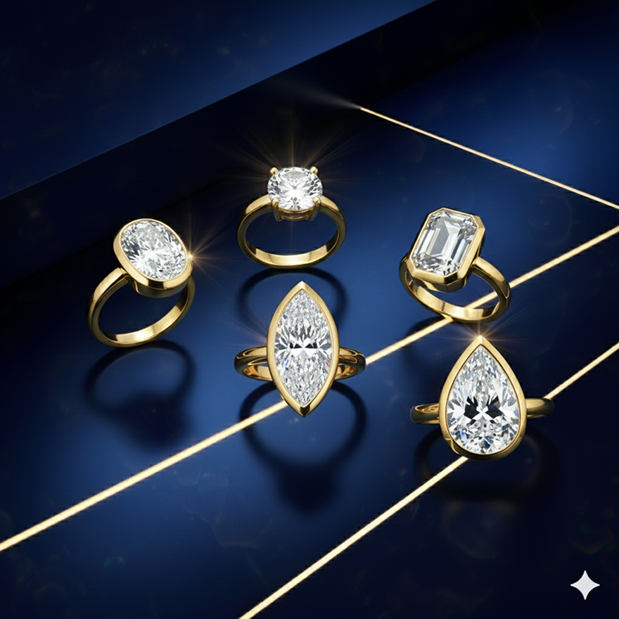 Sleek and secure — bezel settings encase gemstones in smooth metal rims, blending modern minimalism with timeless elegance. A perfect balance of protection and style.